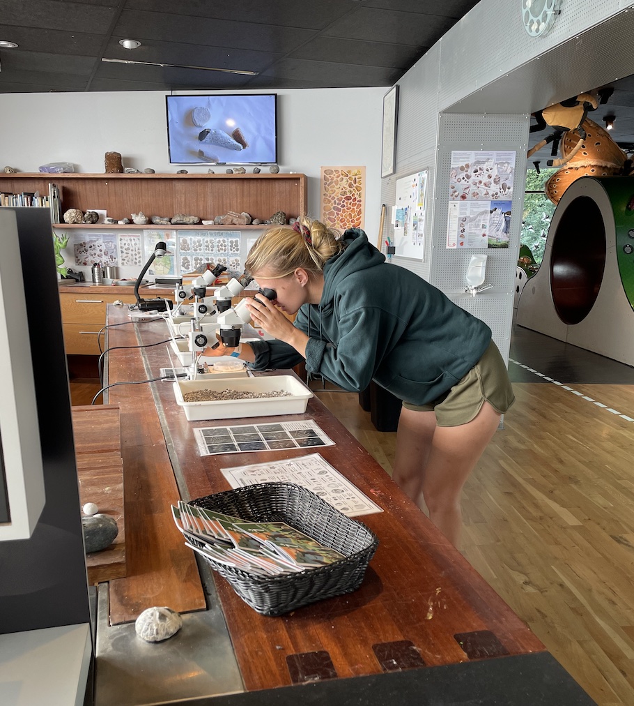 Eine weitere Treppe führte uns dann wieder nach oben in das Naturkundemuseum Geocenter Møns Klint. Ich liebe Naturkunde und Mitmachmuseen. In dem Museum ging es hauptsächlich um die Themen über die Entstehung von Fossilen, Dinosauriern und Bernstein. Außerdem wurde erklärt, wie ein Laie einen echten Bernstein von Unechten unterscheiden kann. Dafür gibt es mehrere Möglichkeiten: zum Beispiel kann man den Bernstein in Salzwasser legen und wenn er oben schwimmt ist es echter Bernstein. Das Museum hat 145 Kronen gekostet (ca. 19€). Studentenrabatt gab es hier leider nicht. Aber der Preis ist total gerechtfertigt und hat sich gelohnt. Also an dieser Stelle auf jeden Fall eine Empfehlung. Die Infotafeln und Videos sind alle auf Englisch, Dänisch und Deutsch gestaltet.