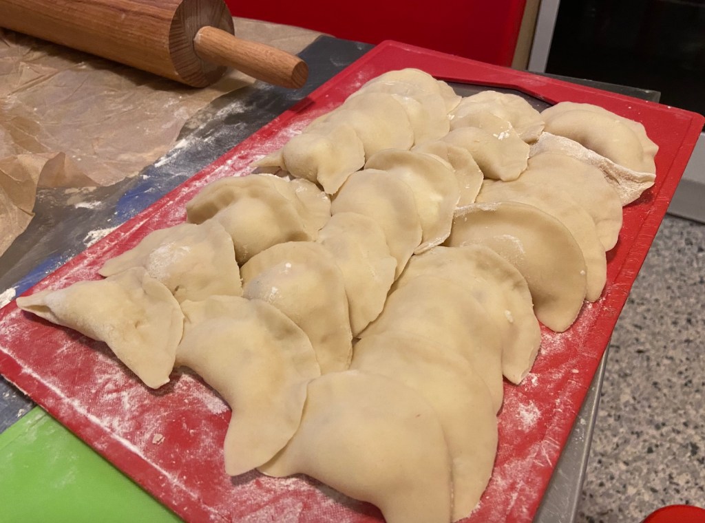 Gestern haben wir polnische Maultaschen für 10 Leute gemacht. Das hat ca. 3-4 Stunden gedauert. Das Rezepte stammte von der Großmutter von der Freundin von einem meiner Mitbewohner. Die Freundin (Paula) hat uns gezeigt wie die Maultaschen gemacht werden.