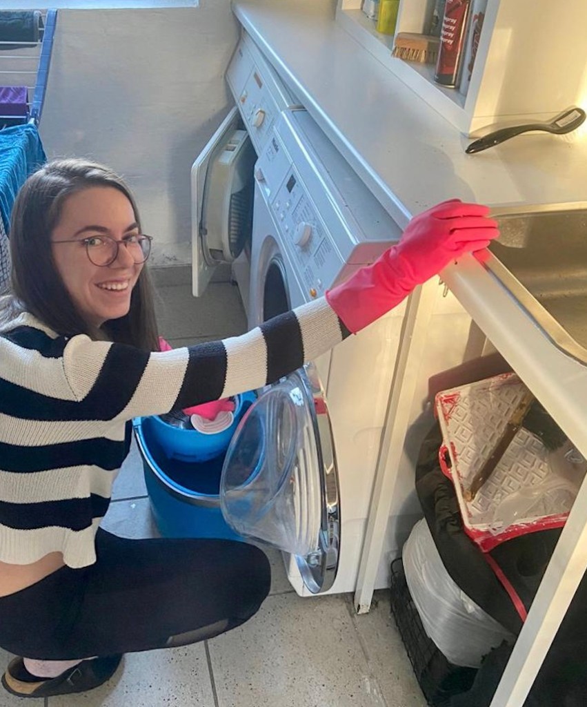 Nachdem sie heute morgen 3 Coins in die Waschmaschine geworfen hat (das wären 3 Stunden waschen) und damit 2 einstündige Waschgänge und zwei halbstündige Waschgänge gewaschen hat, wollte sie die Waschmaschine ein bisschen herausfordern und eine fünfte Maschine mit Küchenhandtüchern anmachen. Dabei muss gesagt werden, dass wir tatsächlich manchmal länger als die „eingeworfene“ Zeit waschen können. Wer kann es sich also jetzt denken was passiert ist!? Genau, die Waschmaschine ging selbstverständlich mitten im Waschen aus, die Handtücher waren klitschnass und die halbe Waschmaschine war auch noch voller Wasser. Theoretisch hätten wir weitere zwei Coins benutzen können, um ein neues Programm zu starten, um so das Wasser wieder abpumpen zu lassen. Das ging natürlich nicht, da es uns weitere 2,60€ gekostet hatte. Was macht Tati also!? Sie schöpft das Wasser per Hand aus der Waschmaschine. 😛 Beweisfoto folgt unten: