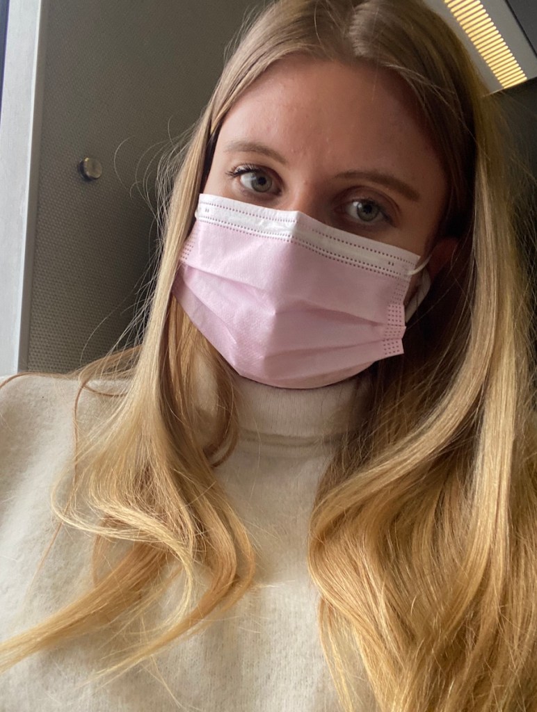 Sobald ich negativ war, bin ich mit dem Zug nach Oldenburg gefahren um mich noch ein paar Tage auszuruhen und mich von meiner Mutter ein wenig verwöhnen zu lassen. Selbstverständlich mussten wir im Zug (in Dänemark) keine Maske tragen. Sobald wir aber die Grenze nach Deutschland überschritten haben, galt natürlich auch die Maskenpflicht. Aufgenommen habe ich diesen Augenblick auf den folgenden zwei Fotos, die nur 2 Sekunden nacheinander aufgenommen worden sind.