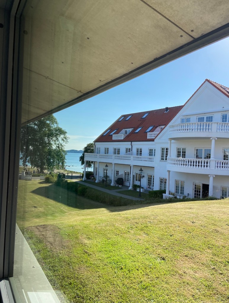 Morgens um 6 Uhr klingelte mein Wecker, um 6:47 ging mein Bus und um 7:10 mein Zug. Erst habe ich überlegt den früheren Bus zu nehmen, aber dann hätte ich über eine halbe Stunde am Bahnhof warten müssen. Da ich diese Strecke ab Herbst jede Woche fahre, wollte ich lieber mal ausprobieren wie pünktlich die Busse hier sind. Hat auch alles pünktlich geklappt. Die Zugfahrt dauert zwei Stunden. Vom Bahnhof in Gråsten (im deutschen Gravenstein) laufe ich 20 Minuten zur Firma. Kenneth (mein Ansprechpartner und „Vorgesetzter“) hat mir dann auch gleich meinen Schreibtisch gezeigt. Nicht wundern, Vorgesetzter habe ich in „“ gesetzt, da ich das hier eher freiwillig und unentgeltlich mache und ich vieles selbstentscheide. Was aber super ist, das mein Transport, Essen und Übernachtung hier bezahlt wird. Übernachten werde ich heute in Sønderborg, das ist 30 Minuten mit dem Bus entfernt von Gråsten. Das Hotel liegt direkt am Strand.