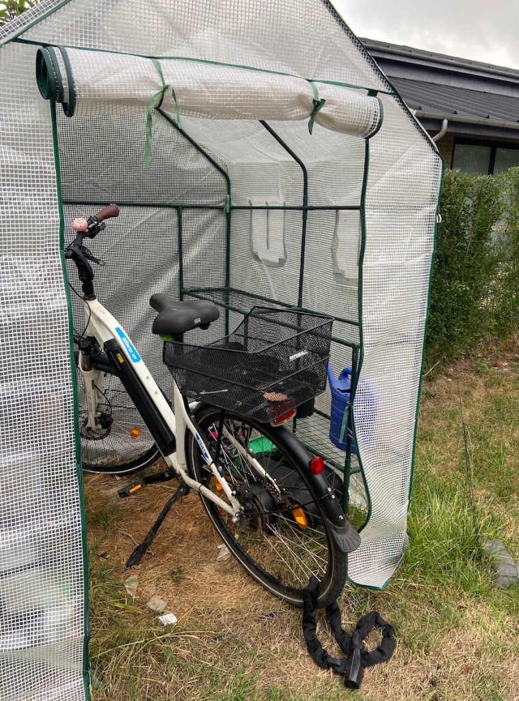 Da meine Pflanzen nun auf sind, kann ich mein Gewächshaus anderweitig benutzen. In diesem Fall wird es eine Fahrradgarage. Ich will das E-Bike nicht wie letztes Jahr wieder den ganzen Winter ungeschützt stehen lassen.