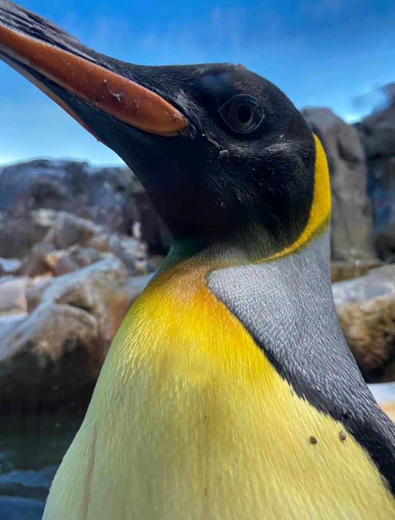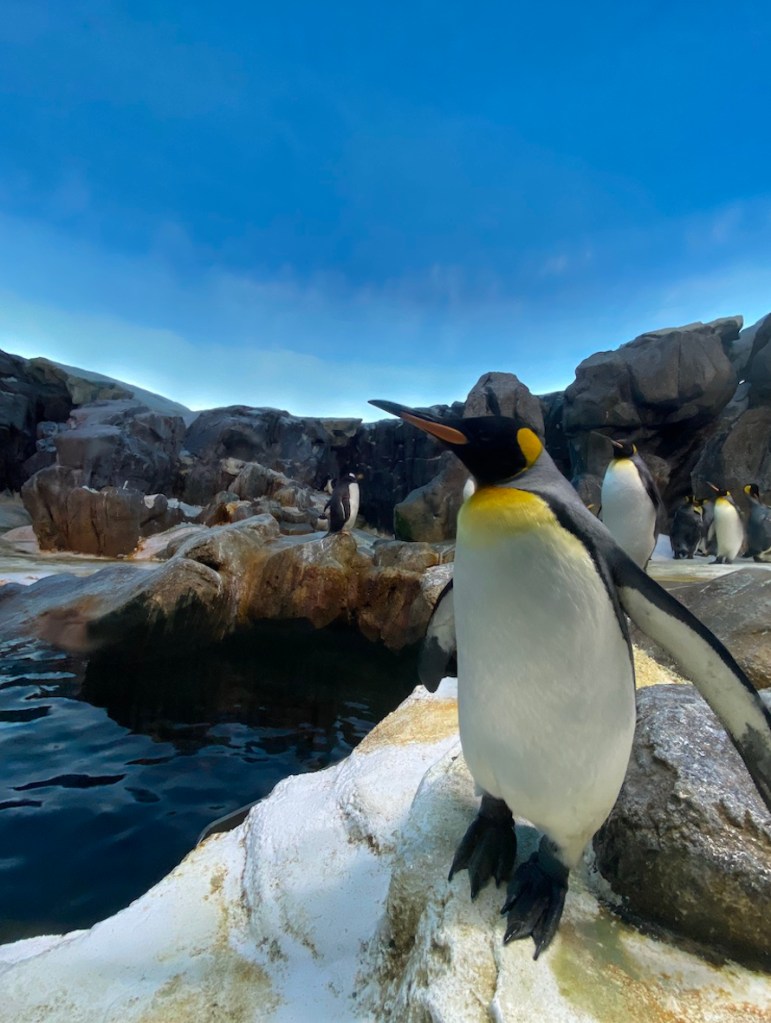 Der Himmel in dem Pinguin Gehege ist nicht echt. Das Gehege befindet sich unter einer Kuppel. Sieht aber wahnsinnig echt aus.
