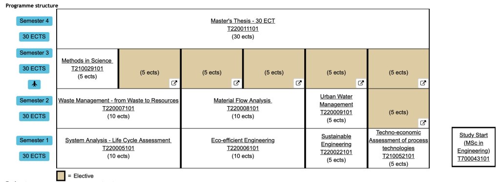 Mein Master umfasst 4 Semester und 120 Credits. Im ersten Semester habe ich nur Pflichtfächer wie ihr unten auf dem Foto sehen könnt. Gerade im dritten Semester kann ich mir die meiste Fächer aussuchen. Allerdings weiß ich noch nicht was das für Fächer sind. Ich kann mir vorstellen, dass ich meinen Schwerpunkt mehr auf Natur, Wald und Holz legen werde, aber das halte ich mir noch offen. Ich freue mich schon sehr auf die Fächer Waste Management und Urban Water Management im zweiten Semester. Das beides sind sehr wichtige Themen, die meines Erachtens immer noch zu wenig behandelt werden.