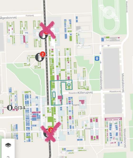 Um uns in der großen Uni zurecht zu finden, gibt es eine App namens „SDU MAPS“ in der ich einfach die Raumnummer in die Suchleiste eingeben kann und schon wird mir der Weg von meinem jetzigen Standort angezeigt. Die schwarze dickere Linie, die einmal durch die Uni führt, ist eine Fahrradstraße und daneben die Strecke einer zukünftigen Straßenbahn, die auch bald fertig gestellt wird. Von dem einen Kreuz zum anderen Kreuz sind es ca. 450 Meter. Also doch schon ein kleine Ecke.
